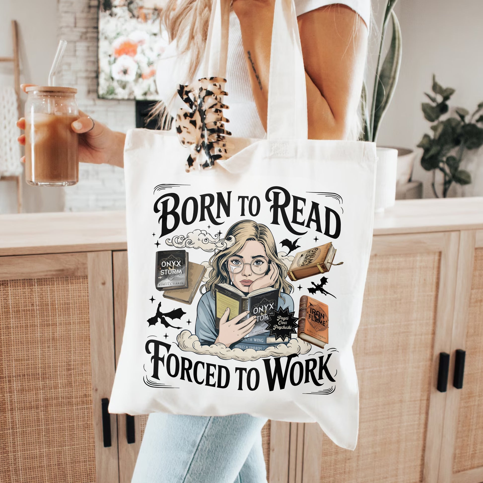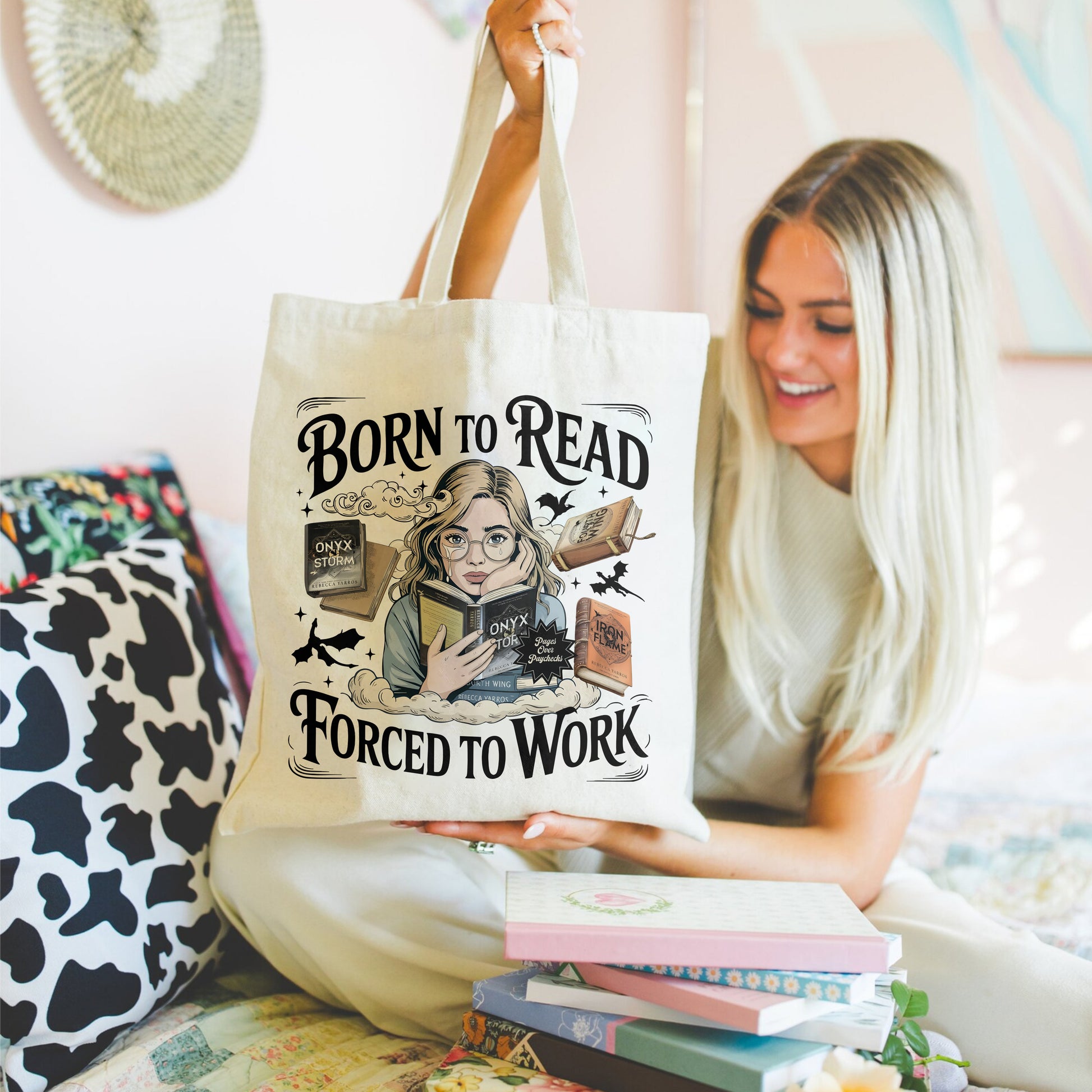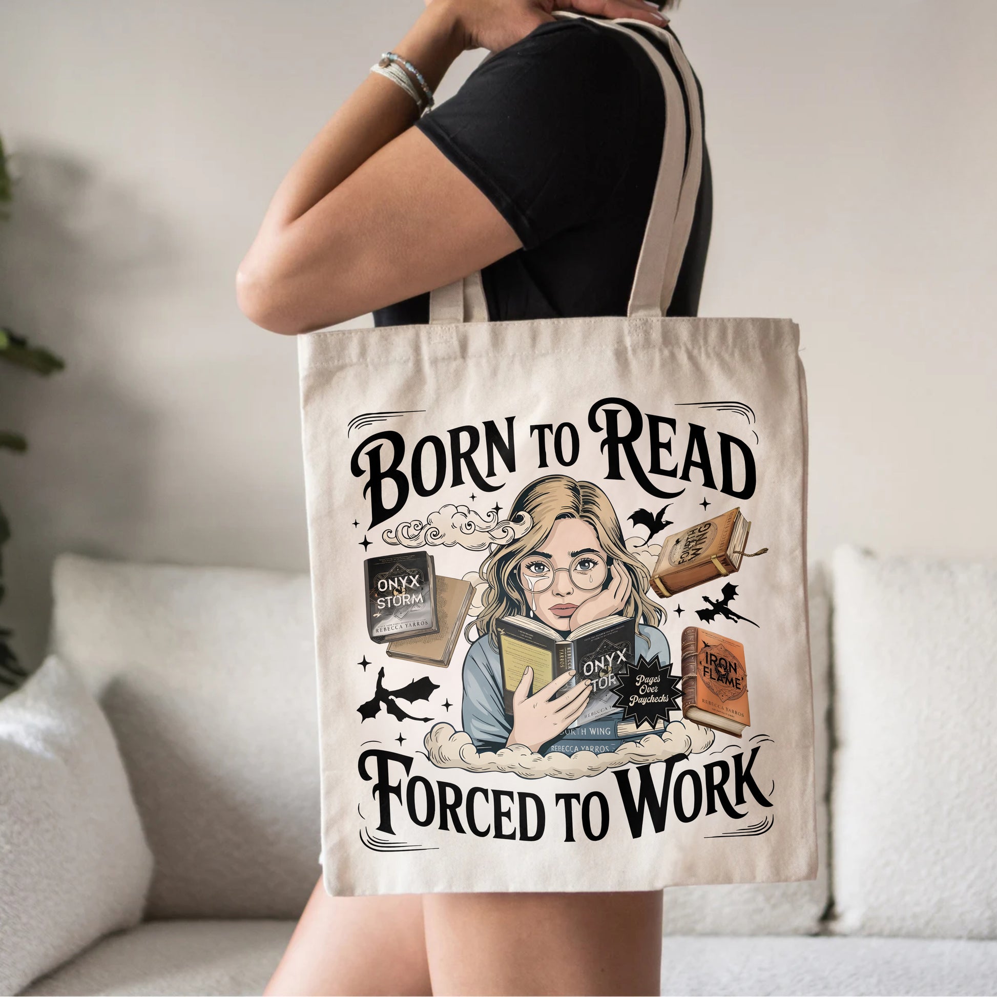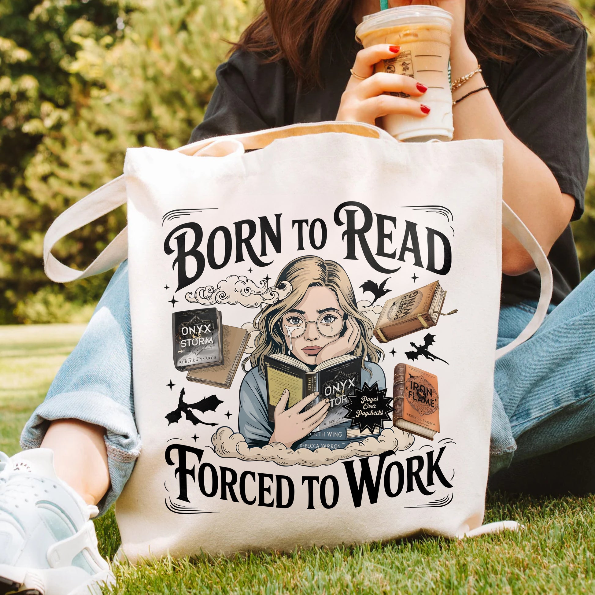 Fuel your fantasy obsession (and your daily grind) with this Born to Read, Forced to Work Tote Bag, featuring fan-favorite titles from Fourth Wing, Iron Flame, and Onyx Storm. With a dreamy book girl at the center and flying dragons in the background, this tote perfectly captures the struggle of living in reality while your heart lives in Basgiath.
